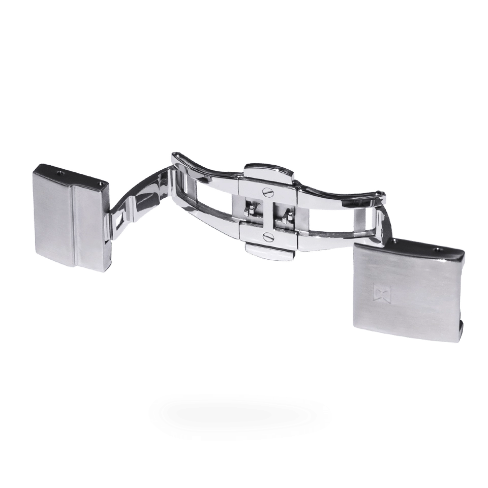 La montre est montée sur un bracelet en acier inoxydable assorti au boîtier. Il est composé de trois rangées de maillons : les parties latérales sont brossées tandis que la rangée centrale adopte une finition polie. Ce contraste discret renforce le style général de la montre. Le bracelet mesure 20 mm d’entrecorne et se referme à l’aide d’une boucle déployante à double poussoir, assurant un maintien sécurisé. Ce type de fermeture facilite la manipulation quotidienne et limite les ouvertures accidentelles.