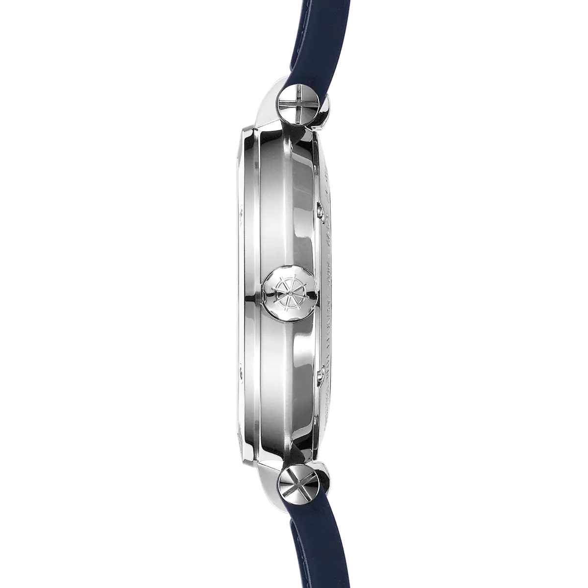 La montre est accompagnée d’un bracelet en caoutchouc bleu, conçu pour offrir confort et durabilité. Ce matériau est particulièrement apprécié pour sa résistance à l’eau, faisant de cette montre un excellent choix pour les activités nautiques. La fermeture du bracelet se fait par une boucle déployante simple de couleur argentée, qui assure une sécurité et une facilité d’utilisation maximale.