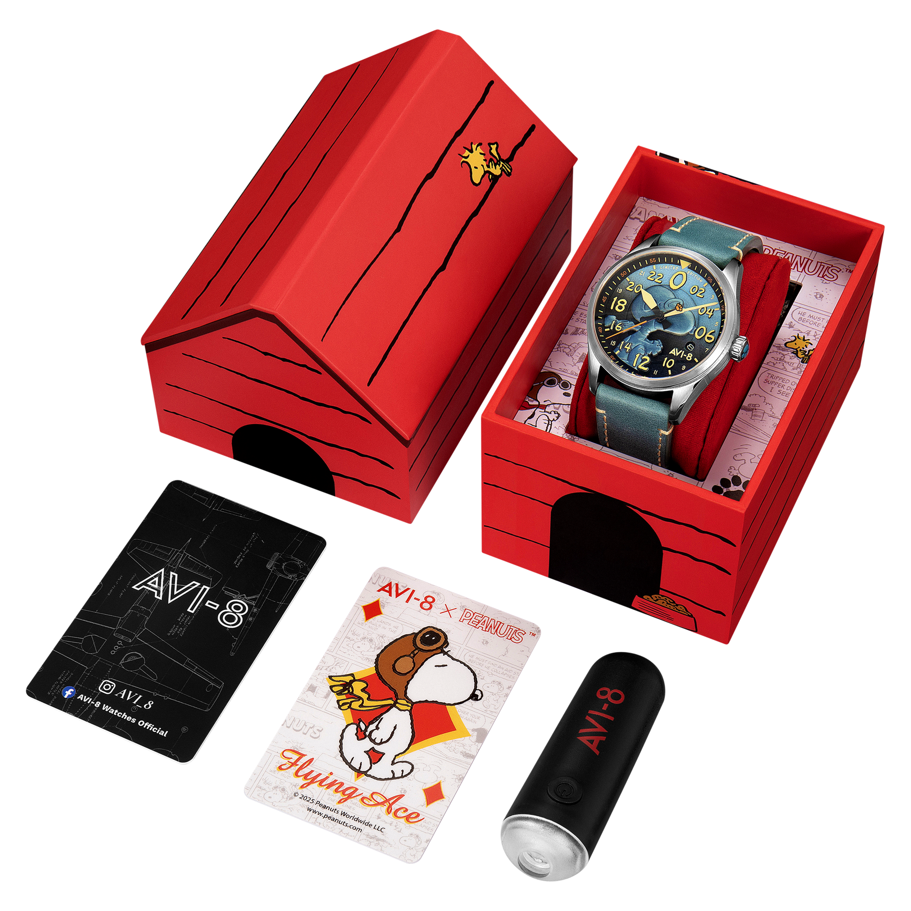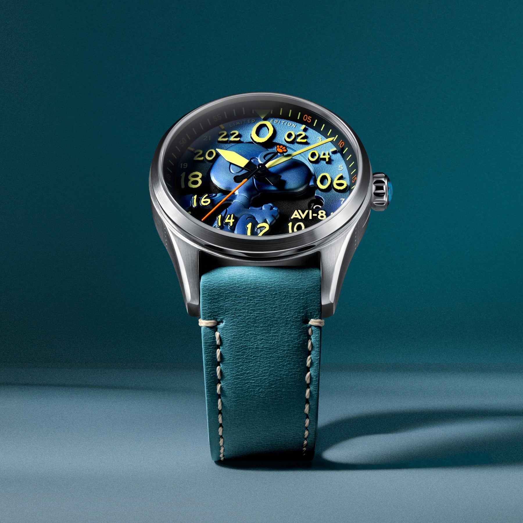 Même base que la AV-4150-02, même édition limitée à 400 exemplaires numérotés, mais cette déclinaison joue sur une palette bleue, grise et noire qui change complètement l'ambiance de la montre. Le résultat est plus sombre, plus aérien — cohérent avec le personnage du Flying Ace. La boîte de présentation en forme de niche de chien est toujours là, et elle reste l'un des meilleurs arguments pour emballer l'expérience collector.