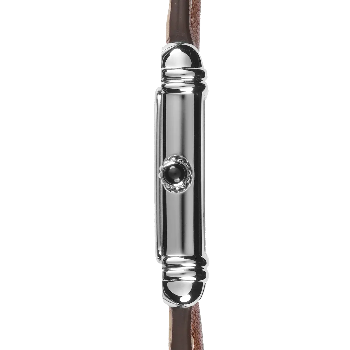 Le bracelet en cuir marron ajoute une touche de raffinement et un confort notable au poignet. Sa couleur riche et sa texture douce contrastent élégamment avec le boîtier en acier, faisant de cette montre un accessoire versatile. La boucle ardillon facilite l'ajustement et garantit que la montre reste sécurisée quel que soit le mouvement.