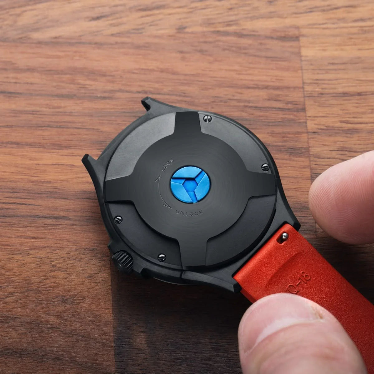 La SYE Chronograph CUT 7 Black DLC utilise le système de bracelet Fastback™. Ce système positionne le bracelet par le dessous du boîtier et le maintient grâce à une vis centrale située au fond. Le résultat donne une esthétique intégrée dans laquelle le boîtier semble posé sur le bracelet, sans cornes apparentes.
