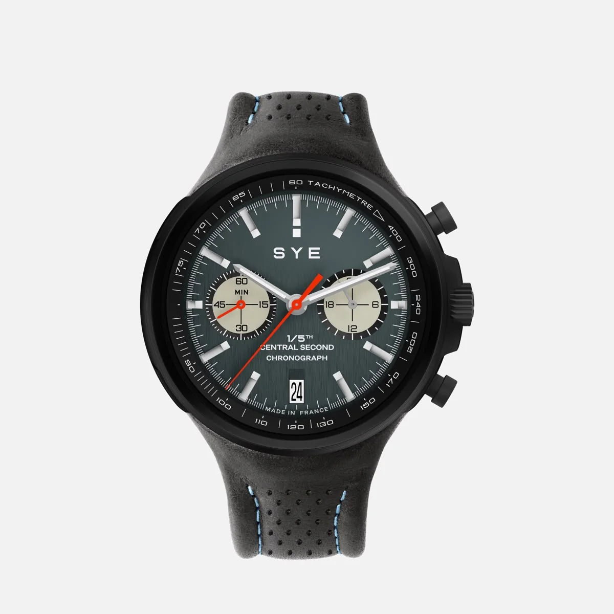 Le boîtier est fabriqué en acier inoxydable 316L et bénéficie d’un revêtement DLC noir qui renforce son aspect sombre. Les finitions alternent entre un brossage marqué sur l’ensemble de la boîte et un microbillage appliqué sur la couronne ainsi que sur les poussoirs du chronographe. L’ensemble crée un contraste de textures volontairement inspiré des pièces mécaniques automobiles.