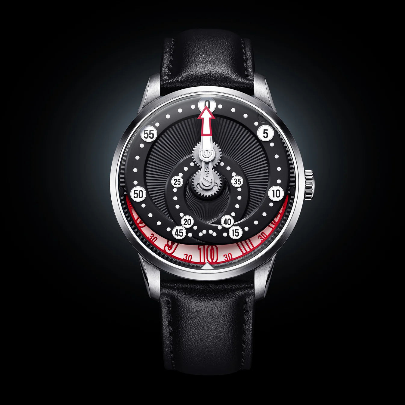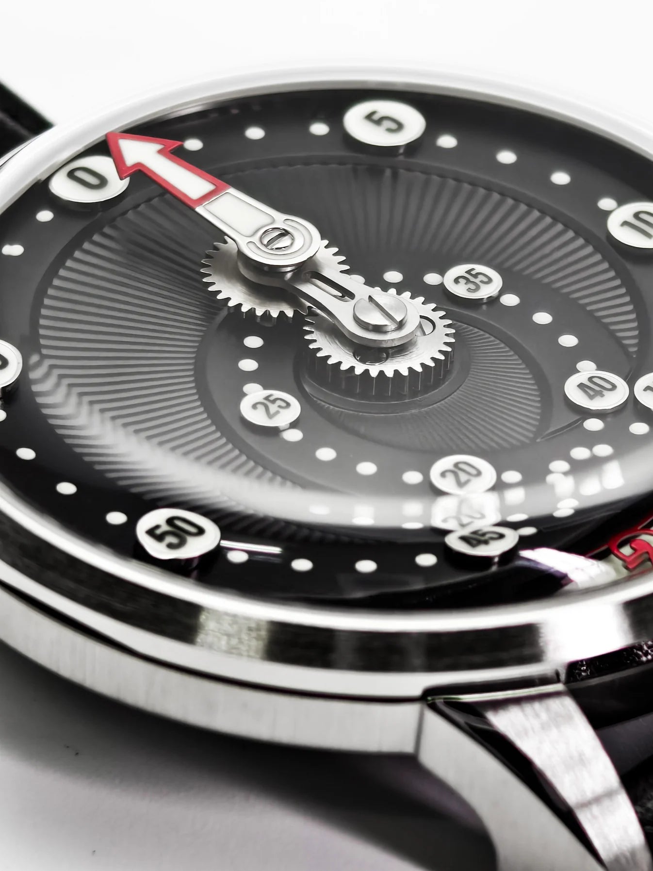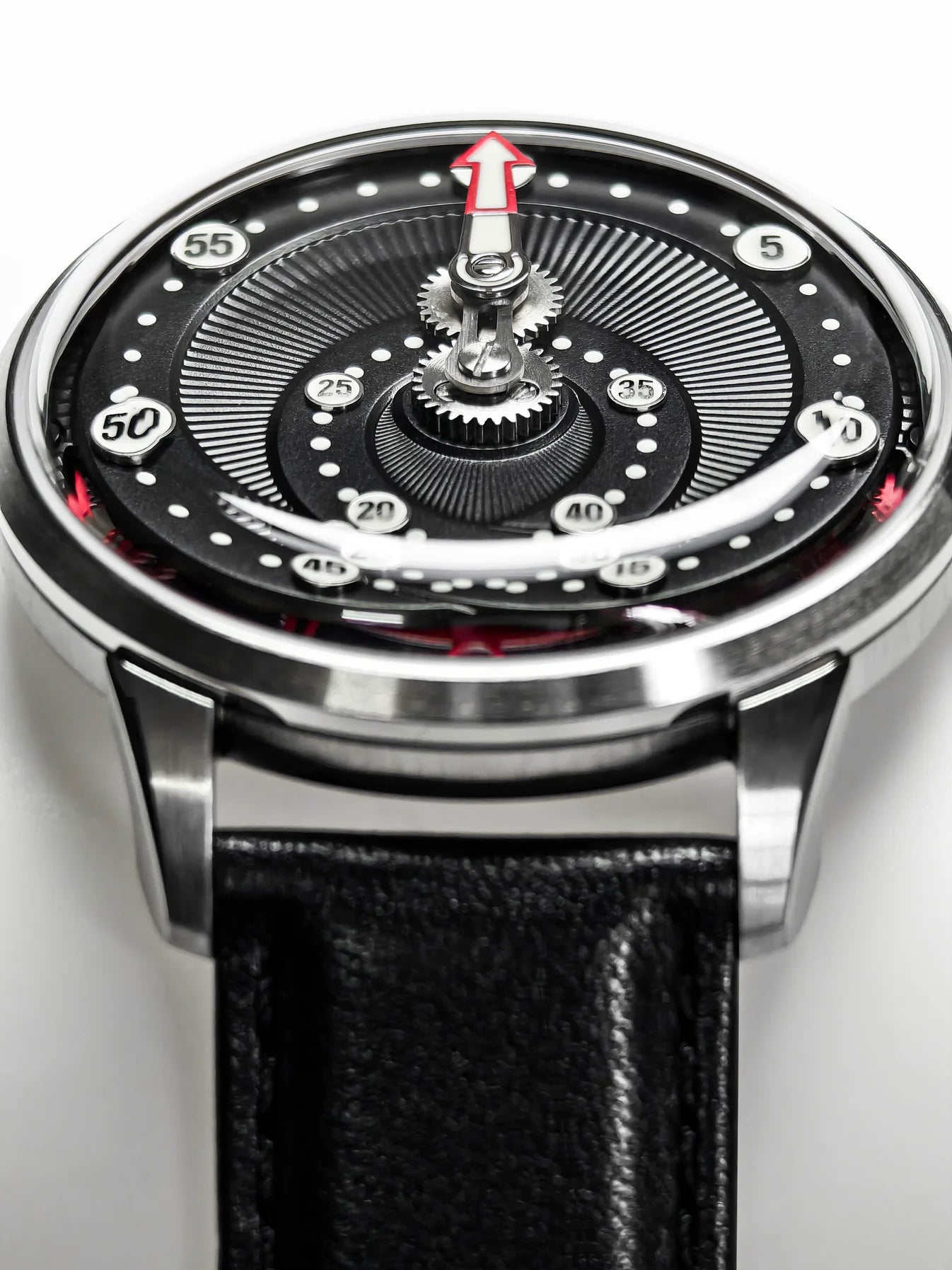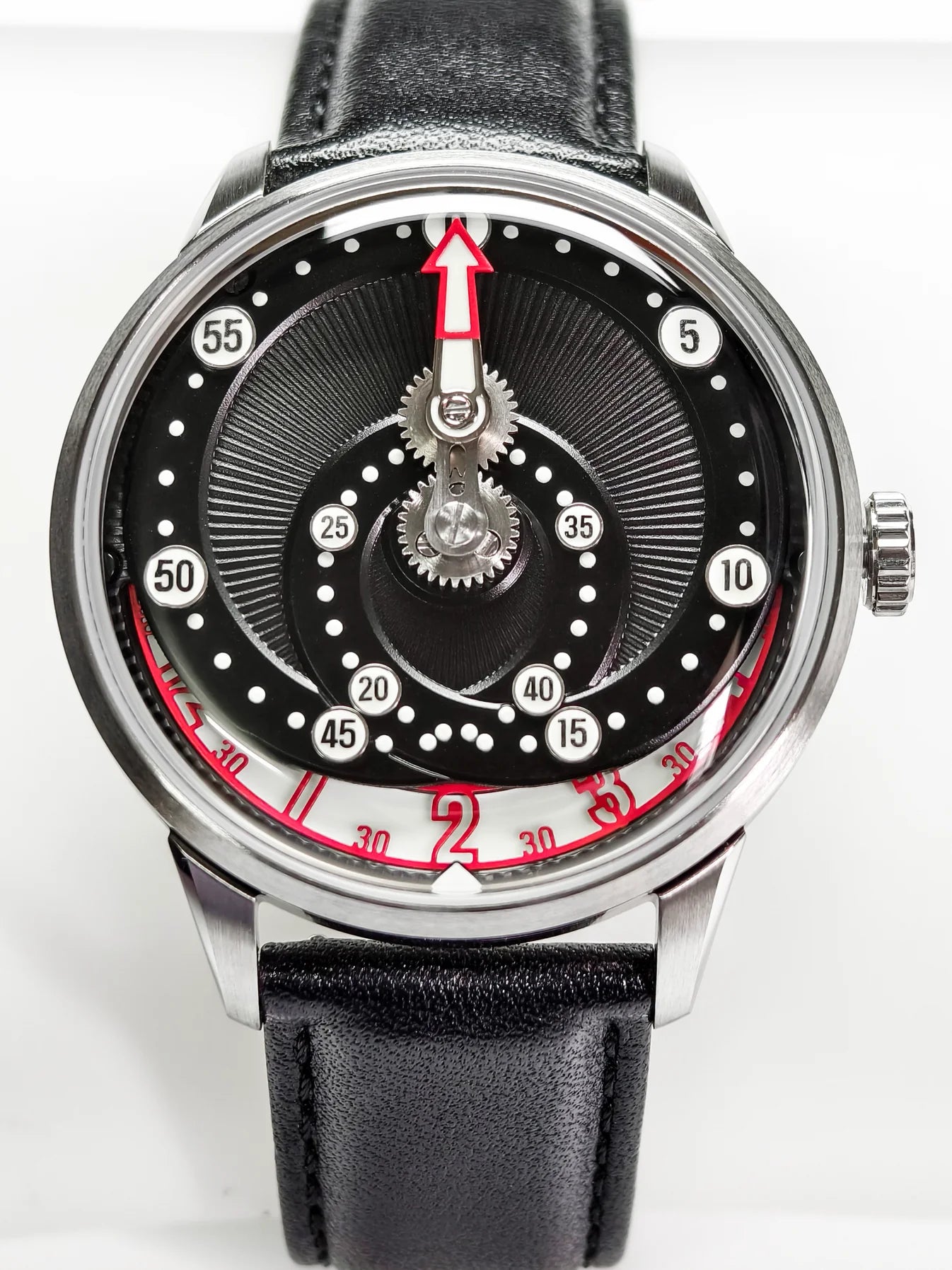 Le cadran repose sur une base noire mate, dépourvue de marquage classique. À la place, un disque rouge en rotation indique les heures à travers des chiffres imprimés, pendant qu’une aiguille rouge pour les minutes trace un cercle continu autour de ce disque central.