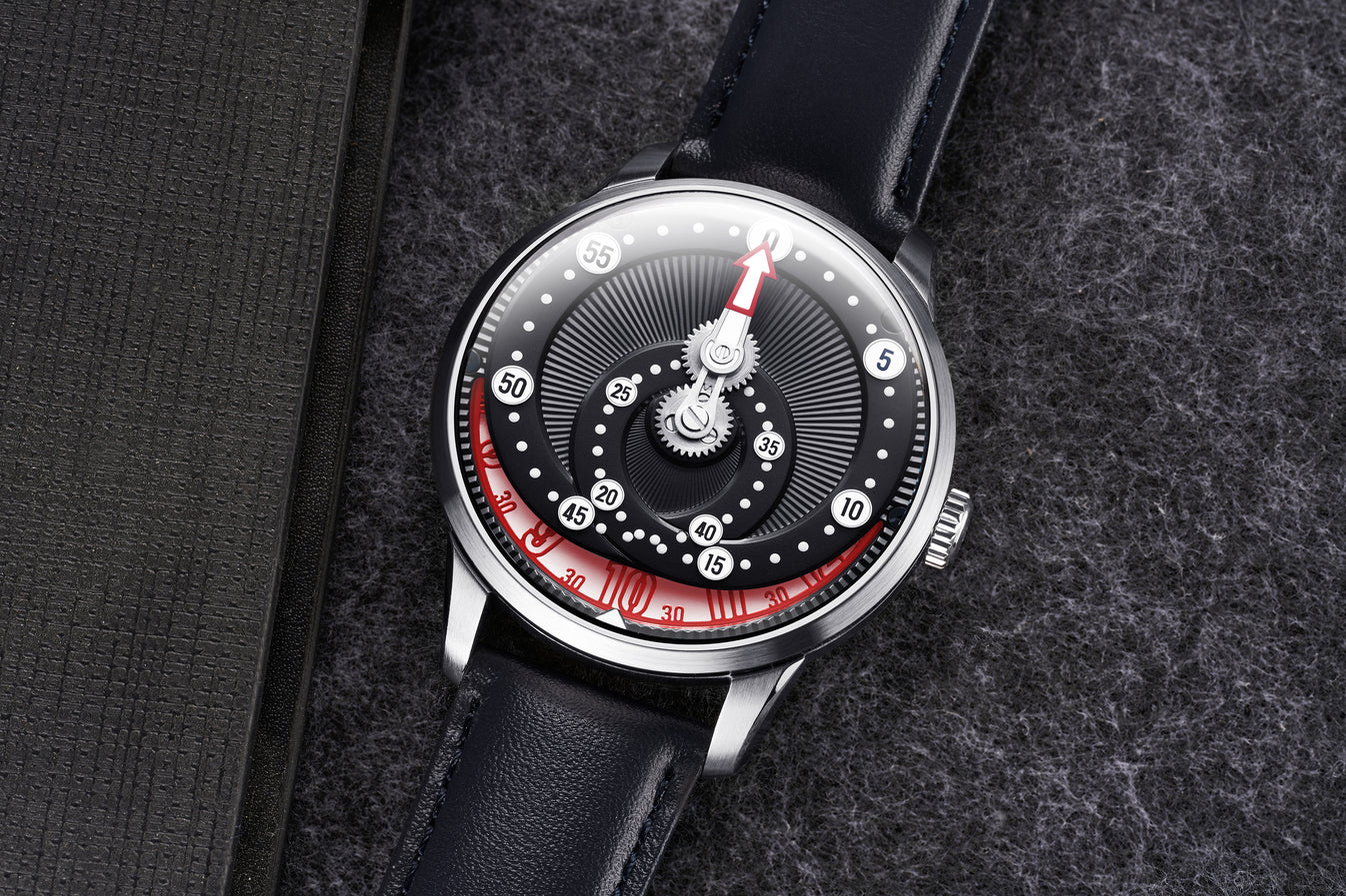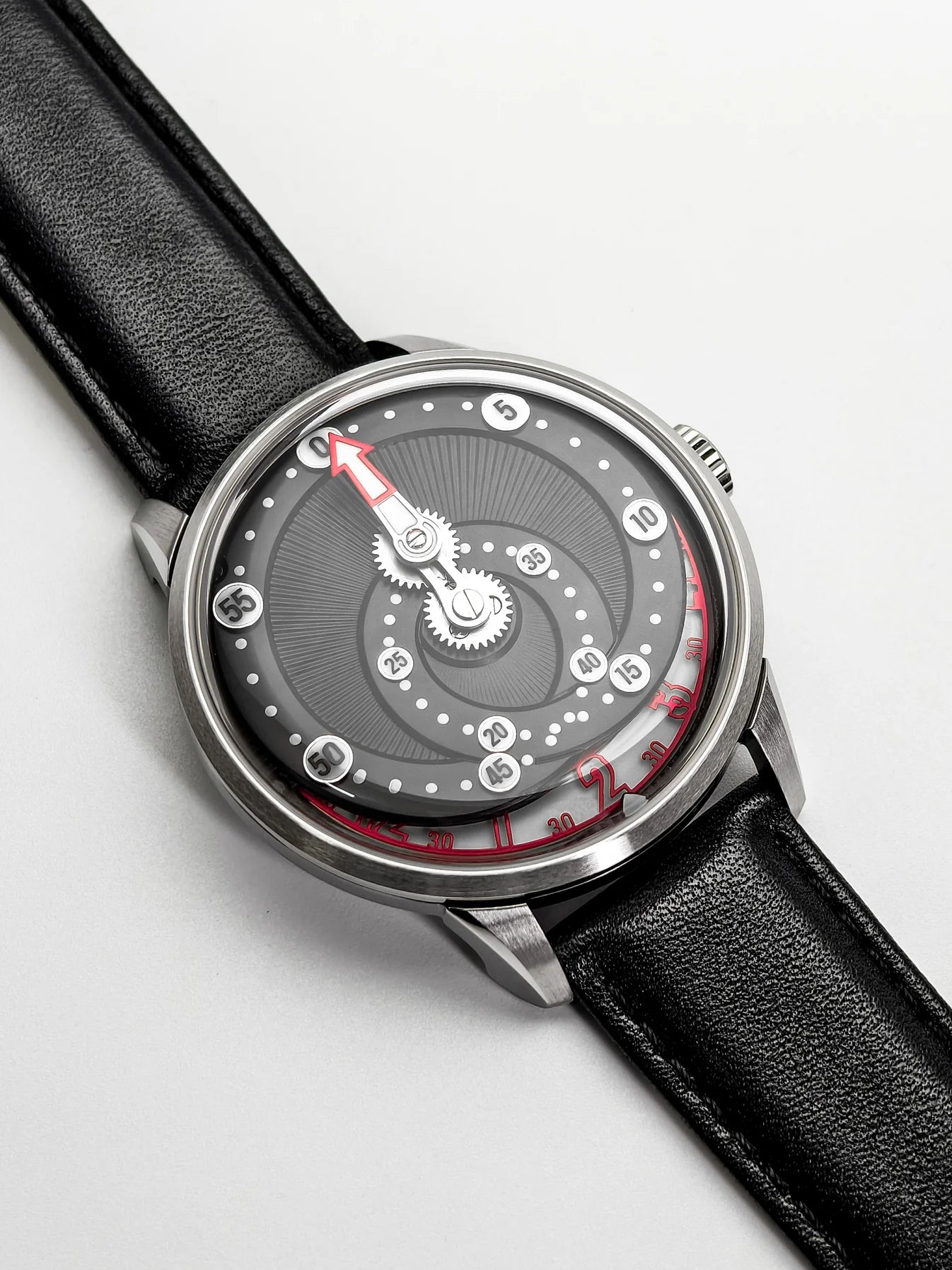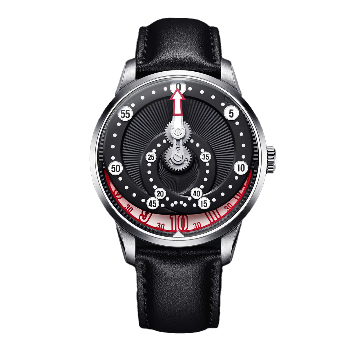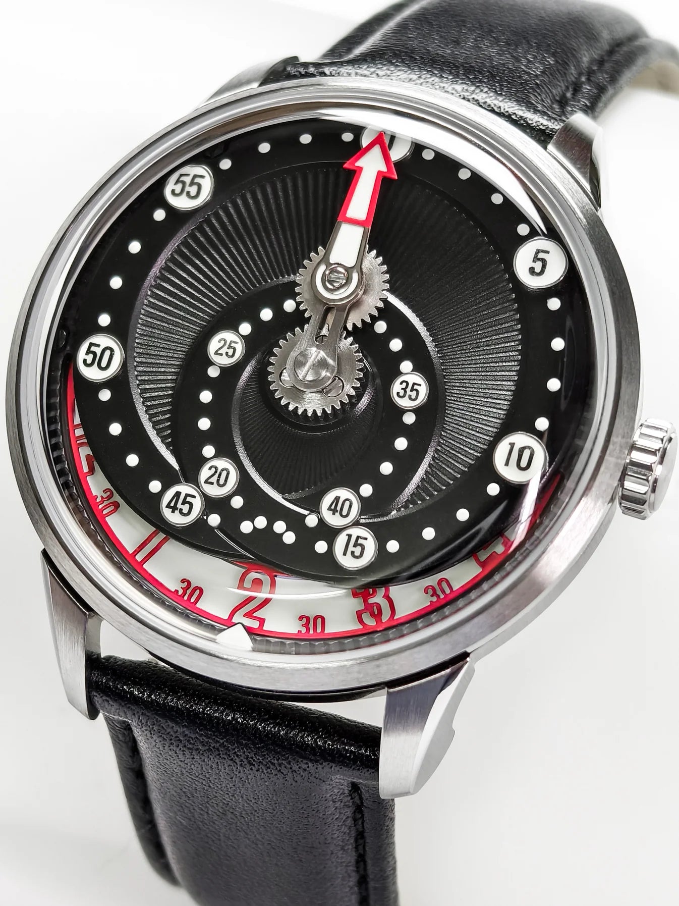 Le cadran repose sur une base noire mate, dépourvue de marquage classique. À la place, un disque rouge en rotation indique les heures à travers des chiffres imprimés, pendant qu’une aiguille rouge pour les minutes trace un cercle continu autour de ce disque central.