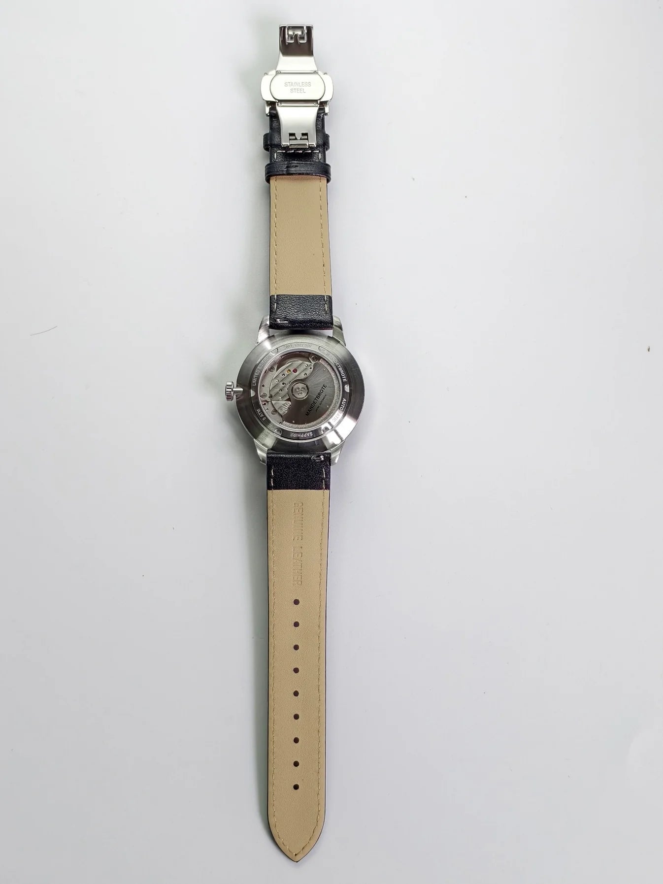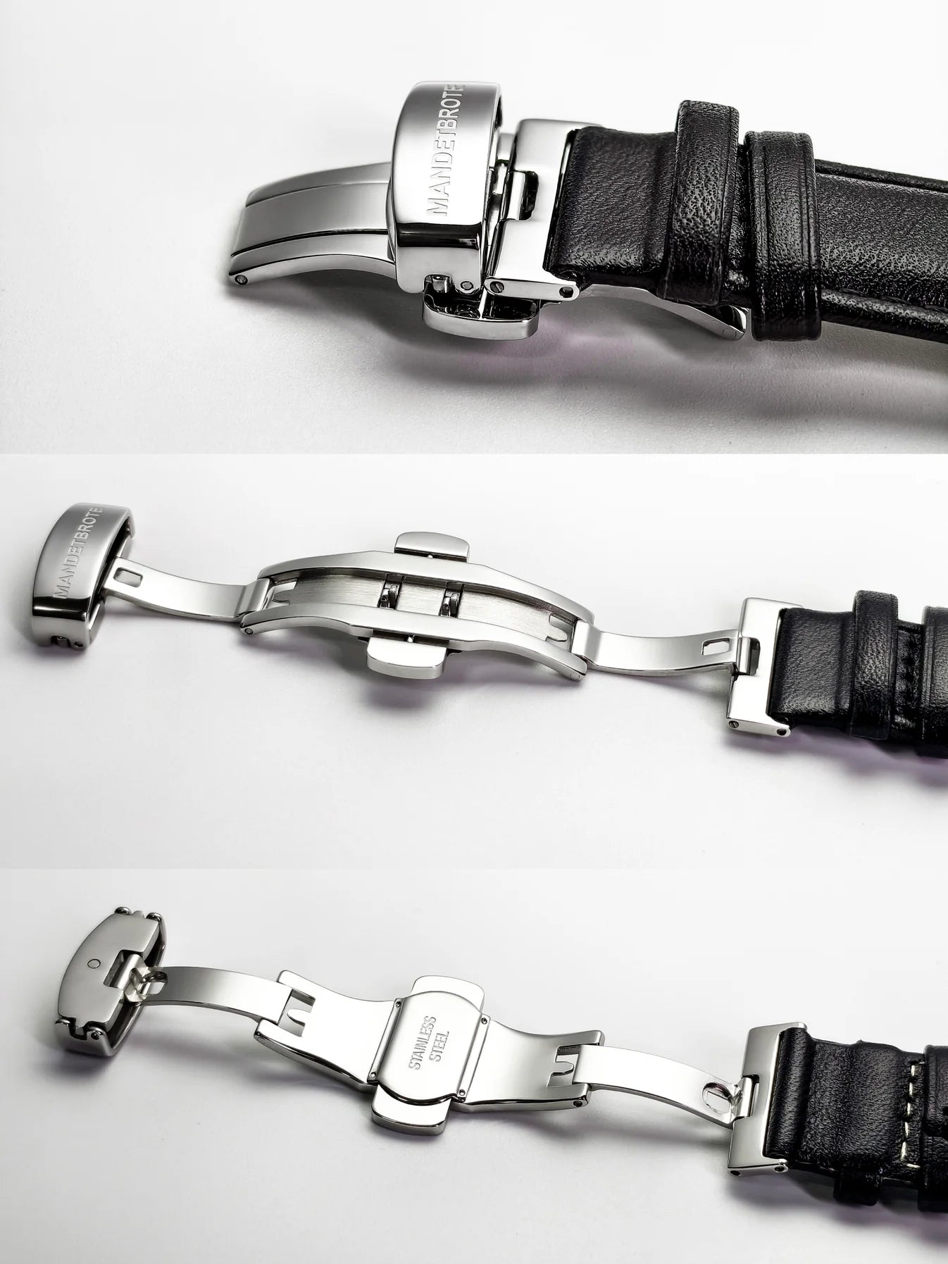 Le système de fermeture est une boucle papillon en acier inoxydable, conçue pour limiter l’usure du cuir dans le temps et assurer une mise au poignet fluide. Le changement de bracelet reste simple grâce aux pompes à ressort traditionnelles.