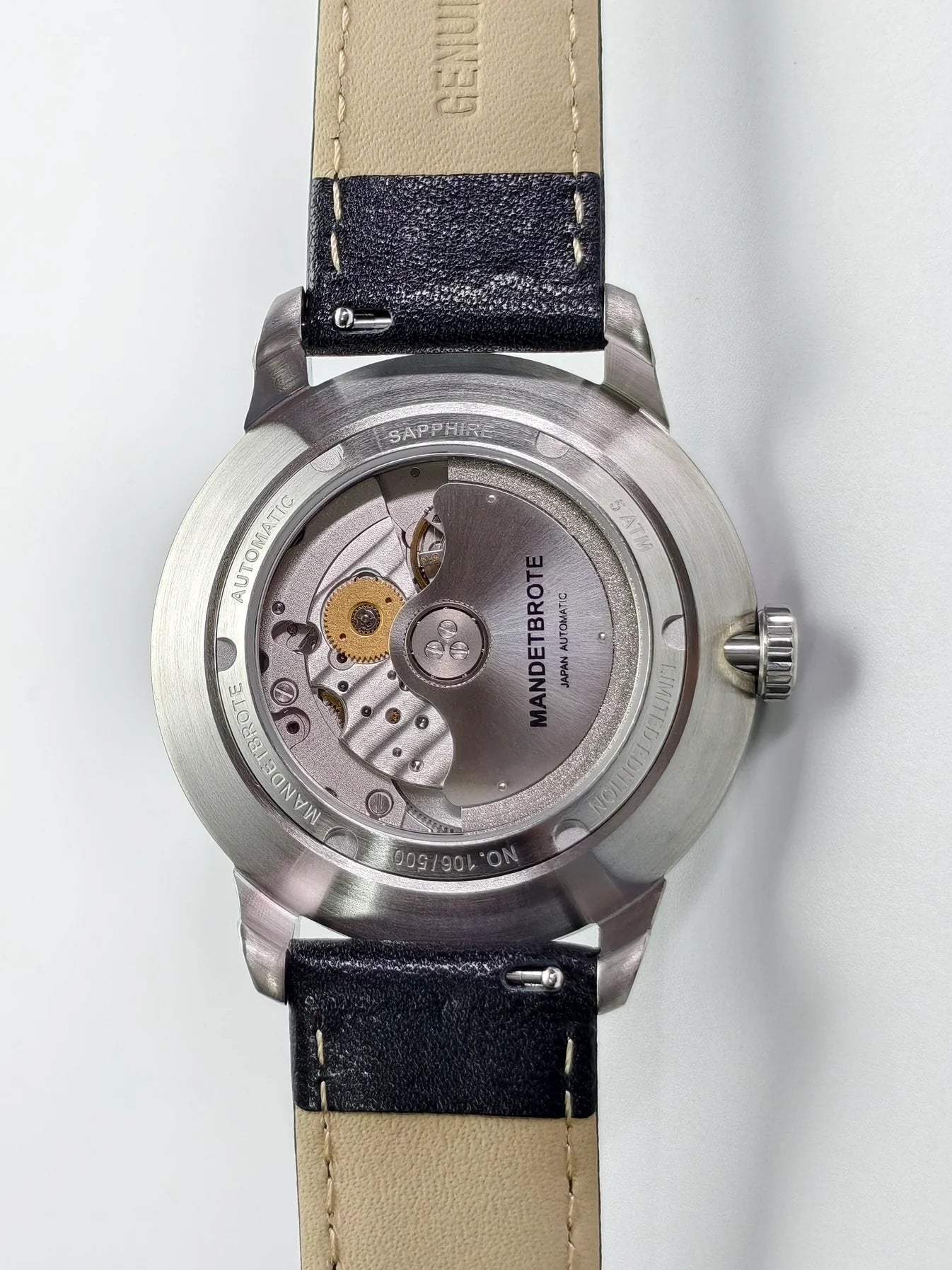 Le fond de boîte est équipé d’un verre saphir transparent, offrant une vue dégagée sur le mouvement automatique en fonctionnement. Chaque montre est numérotée individuellement, avec la gravure correspondante sur le fond vissé.