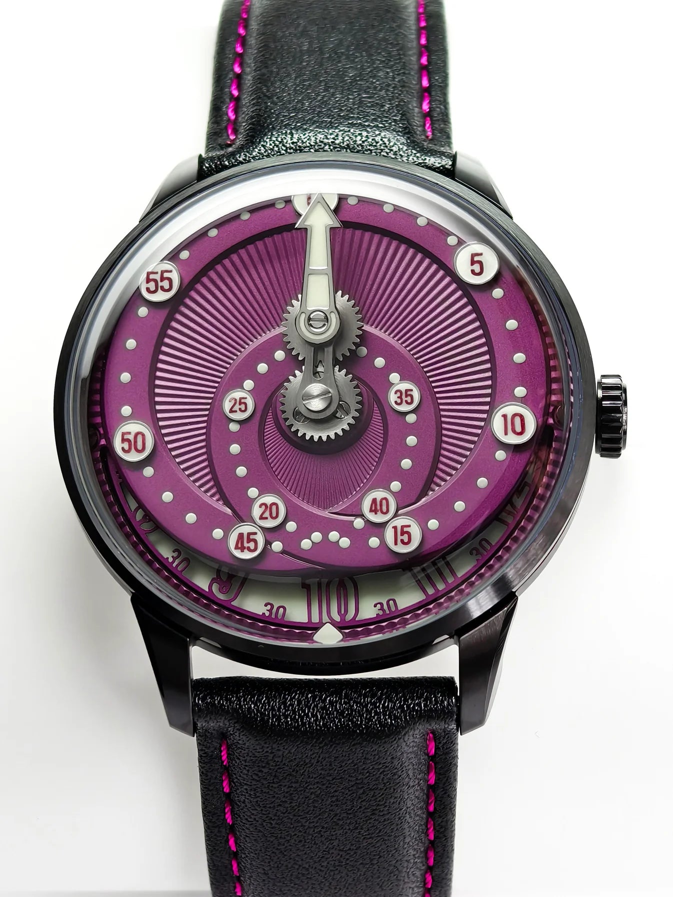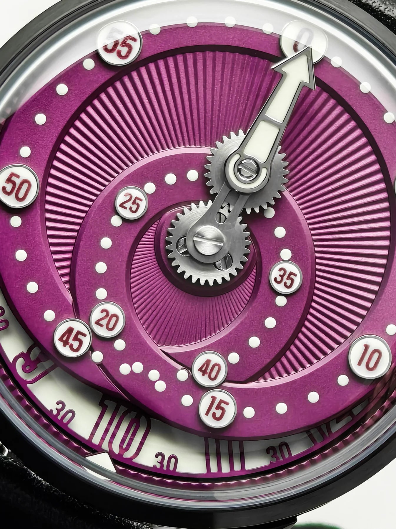 La Mandetbrote Secret Orbital Purple Crush adopte une lecture du temps atypique : les heures sont affichées via un disque central en rotation, tandis que les minutes sont marquées par une aiguille périphérique.