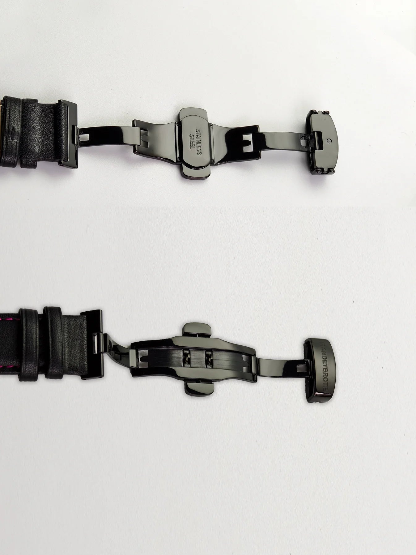 La boucle papillon, fabriquée en acier avec le même revêtement DLC noir, assure un bon maintien tout en limitant la déformation du cuir à long terme.