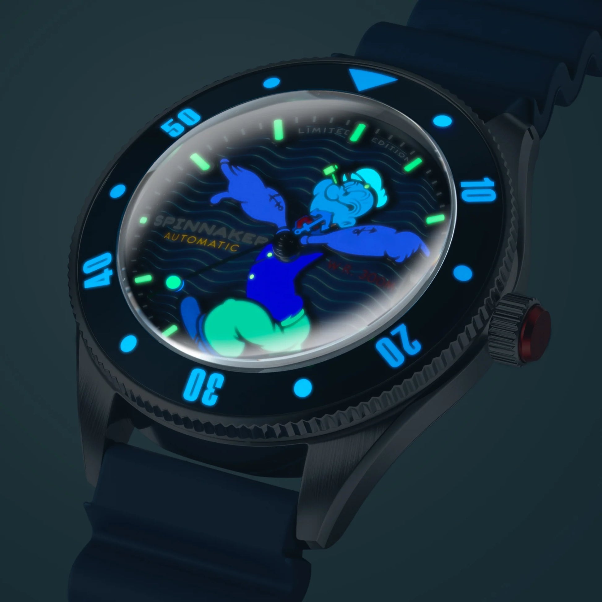 Produite à 425 exemplaires, la Spinnaker Challenger SP-5163-02 s’inscrit dans une série limitée en collaboration avec le personnage de Popeye. Ce modèle reprend les lignes de la collection Challenger, en y intégrant un cadran bleu texturé orné d’une illustration de Popeye en grand. Ses bras sont utilisés comme aiguilles pour les heures et les minutes, et l’aiguille des secondes est accompagnée d’un contrepoids en forme d’ancre. Le fond du boîtier est gravé avec une illustration de Popeye et sa pipe. L’ensemble est complété par un bracelet en caoutchouc assorti, pensé pour un usage quotidien ou en milieu nautique.