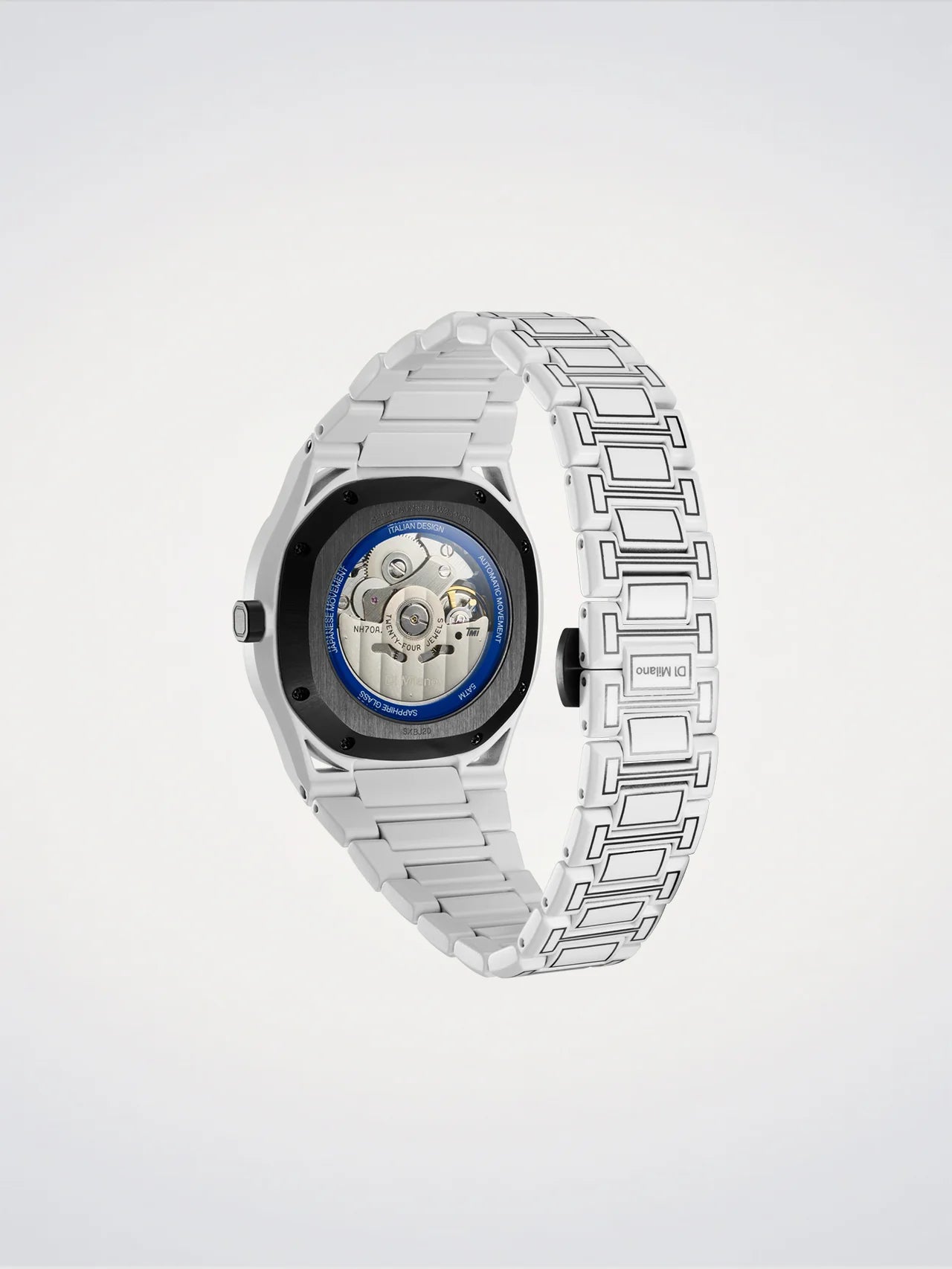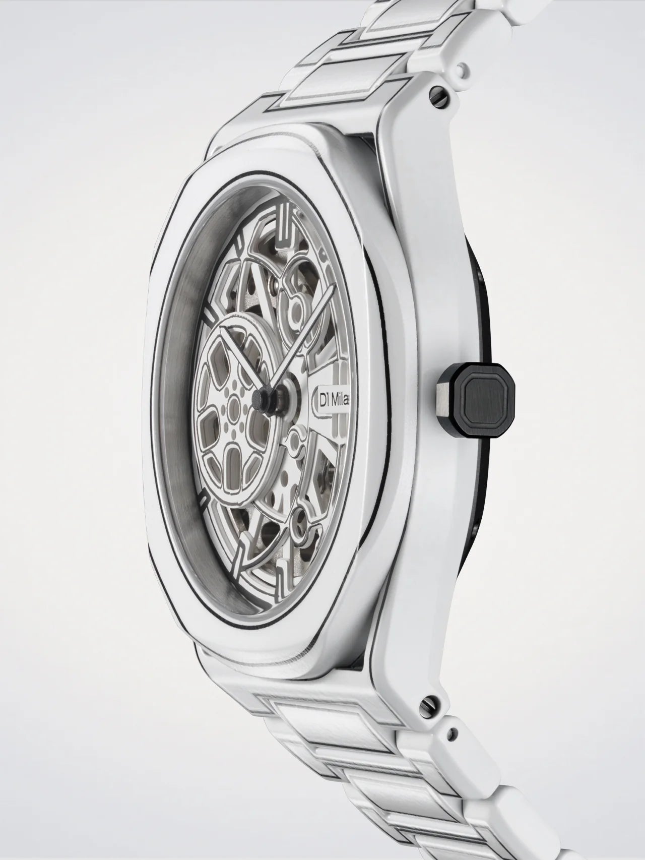 Le boîtier est réalisé en acier inoxydable et recouvert d’un traitement Cerakote® blanc, avec une épaisseur de 13 mm. Ce revêtement céramique est connu pour sa bonne résistance aux rayures et à l’usure du quotidien, et offre un aspect mat qui met en valeur les traits noirs dessinés sur la carrure, la lunette et la couronne. La géométrie anguleuse typique de D1 Milano est bien présente, avec des lignes tendues et des surfaces planes qui donnent une silhouette affirmée au poignet. Au dos, un fond transparent permet de voir le mouvement en action, tout en assurant une tenue fiable de l’ensemble.