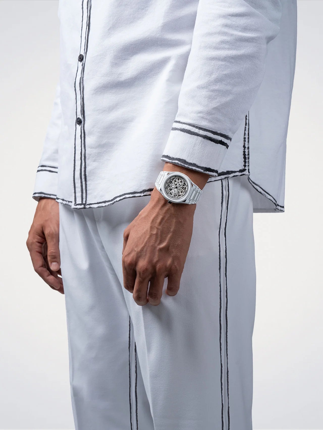 Le bracelet est réalisé lui aussi en acier inoxydable recouvert de Cerakote® blanc, dans la continuité visuelle du boîtier. Les maillons sont travaillés pour prolonger les lignes de la boîte, ce qui renforce l’impression de pièce intégrée. On retrouve sur le bracelet les mêmes tracés noirs que sur le boîtier, comme si l’ensemble avait été dessiné au feutre. La fermeture est assurée par une boucle déployante papillon dissimulée, qui permet de conserver une ligne continue au poignet tout en offrant un maintien sûr. Le poids annoncé de la montre est d’environ 141 g, ce qui donne une présence sensible sans devenir excessivement lourde pour un usage quotidien.