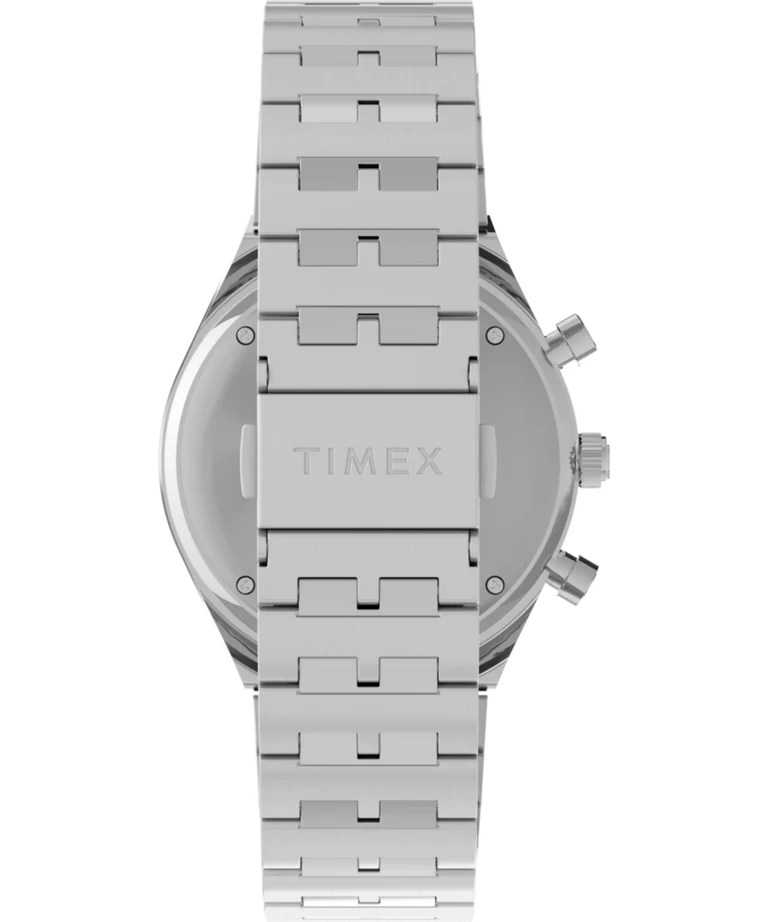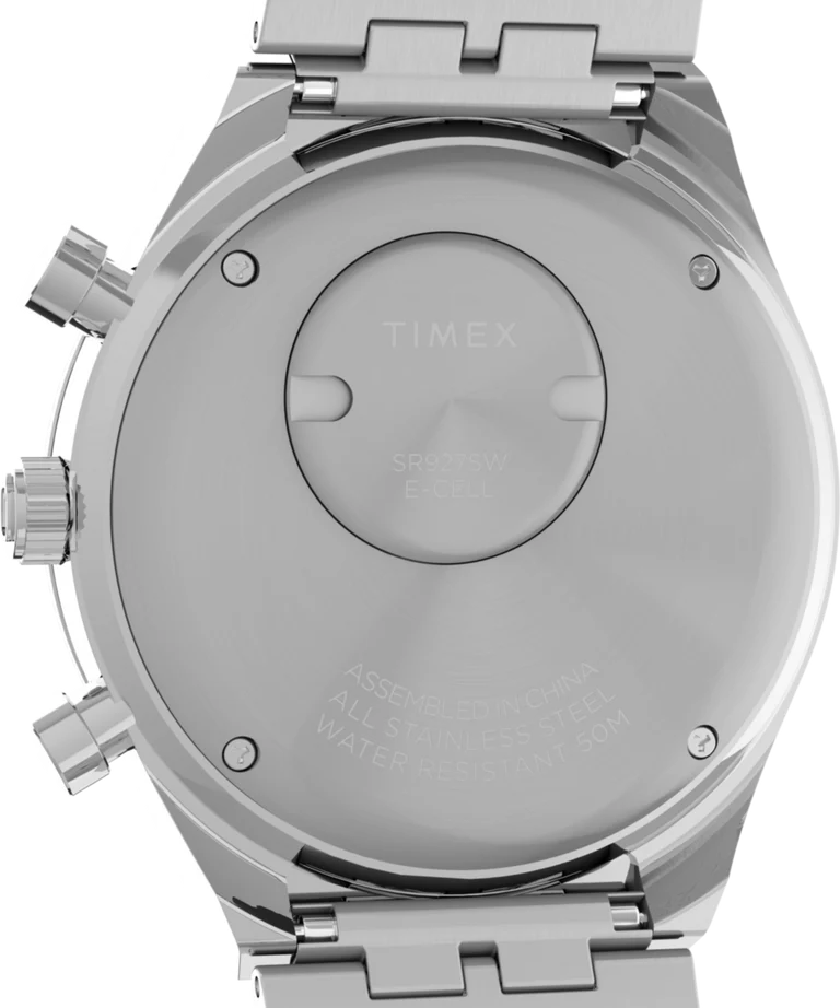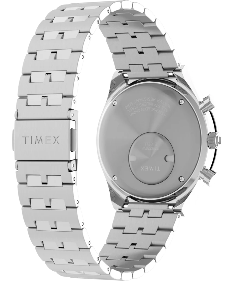 Le boîtier de la Q Timex TW2V42600 est entièrement conçu en acier inoxydable. Il présente une alternance de finitions brossées et polies qui lui donnent un aspect robuste et soigné, sans surcharger le design. Sa forme ronde classique de 40 mm s'adapte à un large éventail de poignets. Avec une épaisseur de 13,5 mm, cette montre offre une présence certaine sans être excessive. La lunette fixe gravée d’une échelle tachymétrique permet de calculer une vitesse moyenne à partir d’un temps chronométré. Trois boutons latéraux, dont deux poussoirs et une couronne centrale, viennent compléter la configuration classique des chronographes. Le fond de boîte, maintenu par des vis, participe à la solidité de l’ensemble.