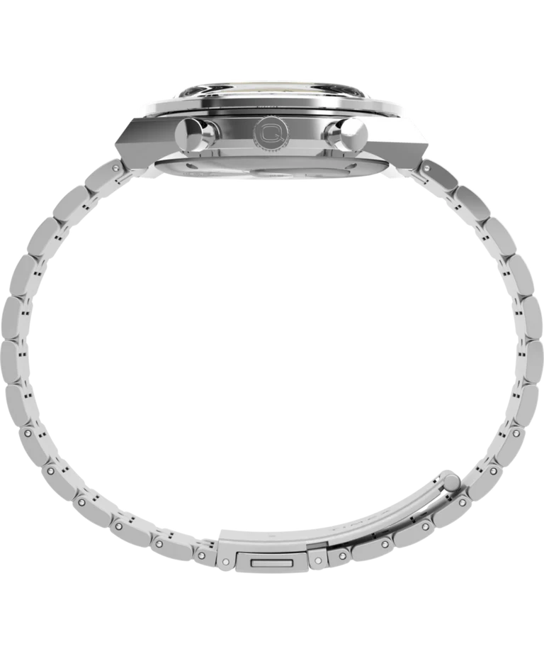Le bracelet de cette Q Timex est en acier inoxydable, avec des finitions brossées et polies qui font écho à celles du boîtier. Il se compose de maillons ajustables et se fixe grâce à une boucle déployante. Ce type de fermoir permet une mise au poignet rapide et sécurisée. La largeur entre les cornes est de 18 mm, un format courant qui offre une bonne polyvalence et facilite les éventuels changements de bracelet. Le style du bracelet, tout en sobriété, s’accorde bien avec l’allure générale de la montre, dans un esprit utilitaire discret.