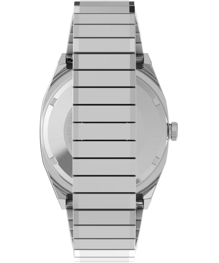 Le bracelet de la Timex Automatic 1983 E Line Reissue est un bracelet extensible Perfect Fit en acier inoxydable. Ce système ajustable permet de retirer ou d’ajouter des maillons sans outil, afin d’obtenir un ajustement précis. Sa largeur à l’entre-corne est de 20 mm. Les maillons présentent une alternance de finitions brossées et polies, assorties à la finition du boîtier. Ce bracelet, typique des modèles de cette période, combine confort et praticité. Il s’adapte facilement à la forme du poignet et se retire sans effort. L’ensemble conserve une allure rétro tout en étant fonctionnel au quotidien.