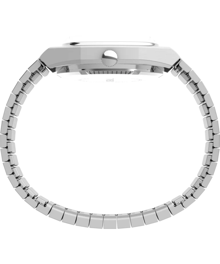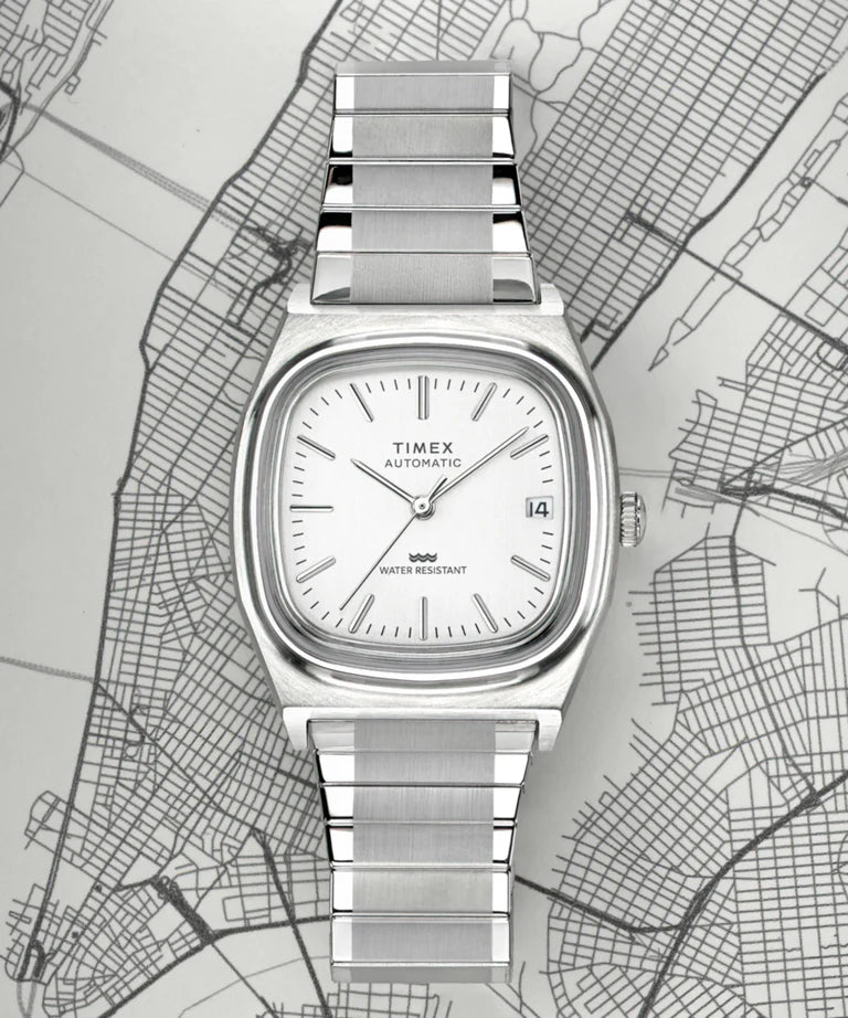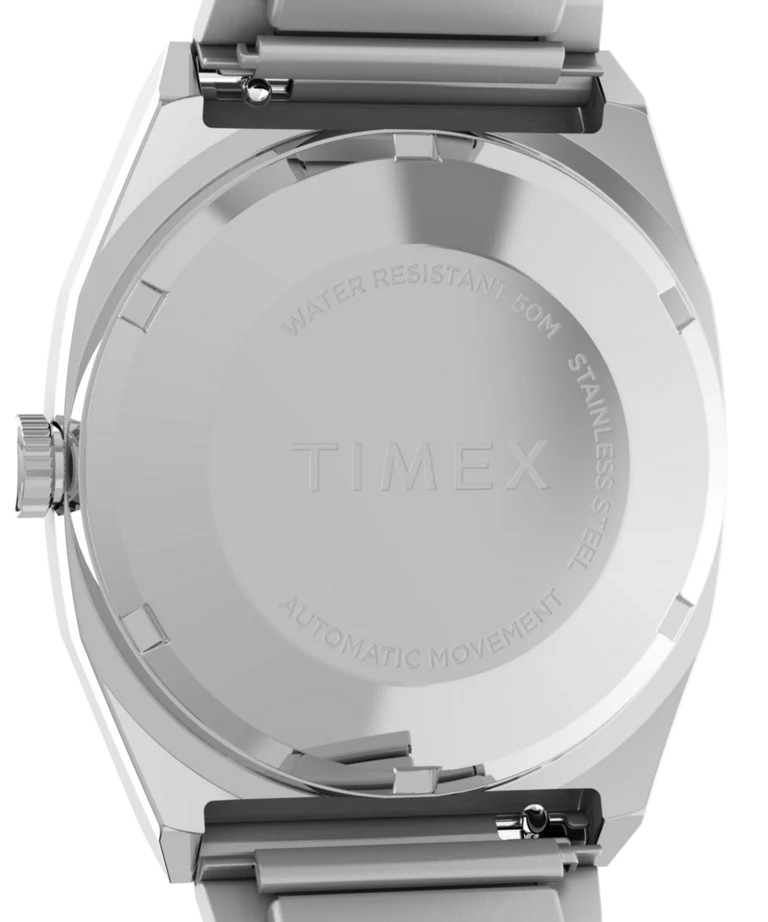 Le cadran affiche une teinte argentée uniforme, en cohérence avec le boîtier et le bracelet. Les index bâtons se détachent nettement sur le fond clair, facilitant la lecture du temps. Un chemin de fer des minutes court le long du bord intérieur du cadran pour plus de précision. Les trois aiguilles centrales indiquent respectivement les heures, les minutes et les secondes. À 3 heures, un guichet de date discret apporte une fonctionnalité supplémentaire sans rompre l’équilibre visuel. Le logo Timex figure sous l’index de midi, accompagné de la mention « Automatic ». L’ensemble dégage une impression de clarté et de simplicité, fidèle à l’esprit des montres habillées de l’époque.