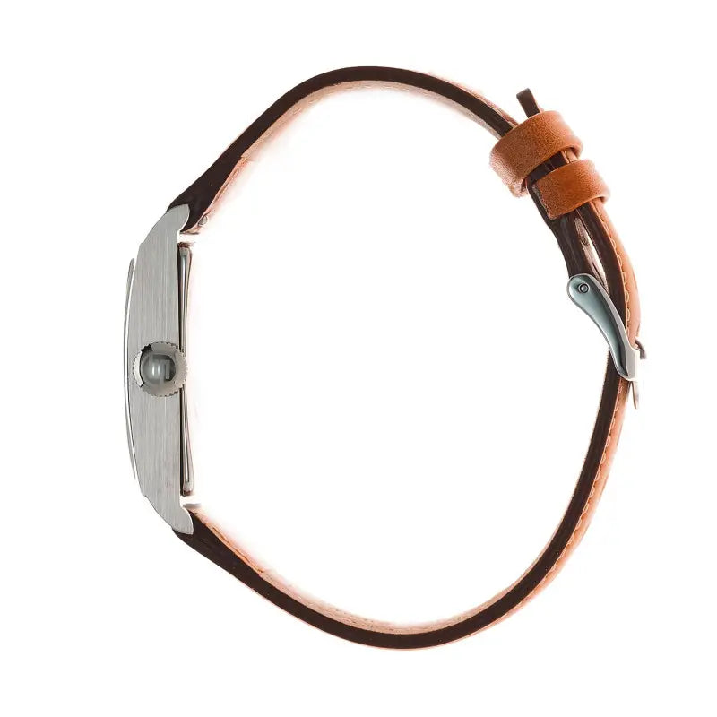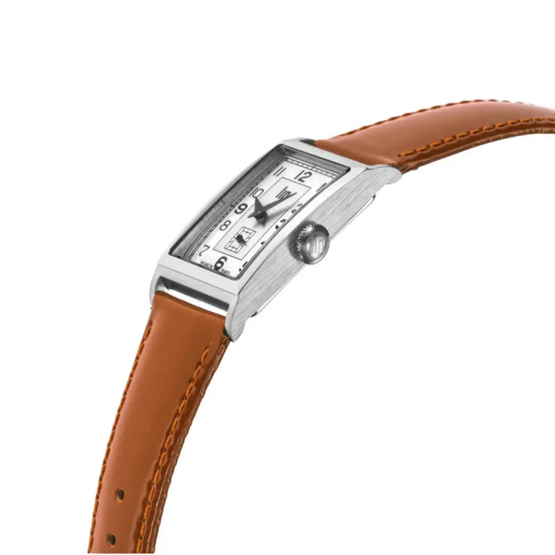 Le bracelet en cuir de vachette marron clair complète l’aspect vintage de la montre. Les surpiqûres blanches soulignent le design classique et apportent un léger contraste. Il mesure 18 mm d’entrecorne et se ferme à l’aide d’une boucle ardillon argentée.