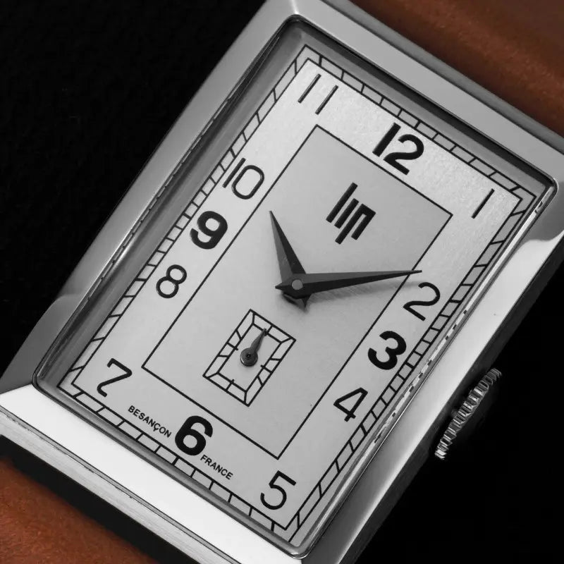Le cadran bi-ton argenté offre une lecture claire des heures grâce à ses chiffres arabes et son chemin de fer des minutes. Deux aiguilles dauphines centrales indiquent les heures et les minutes, tandis que la petite seconde se trouve sur un sous-cadran à 6 heures. Le logo LIP est apposé sous l’index de 12 heures, pour une signature discrète.