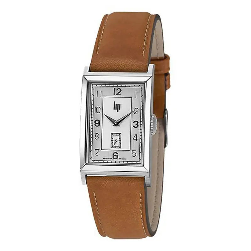 La LIP Churchill T24 671276 combine un boîtier rectangulaire argenté, un cadran bi-ton clair, un mouvement quartz suisse et un bracelet en cuir marron. Elle offre une allure classique et discrète adaptée à un usage quotidien, tout en conservant l’authenticité de la collection Churchill.