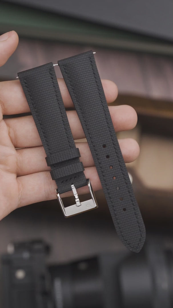 Le bracelet Delugs Toile de Voile Signature Noir est d'une épaisseur de 4,5 mm à l'entrecorne à 2,2 mm à l'extrémité des brins. Le caoutchouc FKM utilisé est moulé pour reproduire l’aspect du tissu à voile traditionnel. Sa capacité à résister à la chaleur, à l'humidité et à l'eau en fait un excellent choix si vous cherchez un bracelet capable de faire face aux conditions climatiques variées. Le bracelet est équipé d'une boucle ardillon brossée classique siglé Delugs, ajustée à la largeur de l'attache du bracelet. Le système de barrettes à ressort à dégagement rapide permet de changer facilement de bracelet sans avoir besoin d'outils, une fonctionnalité pratique pour ceux qui aiment varier leurs styles. Les bords du bracelet sont soigneusement scellés avec plusieurs couches de peinture, assurant une finition lisse et durable. Enfin, chaque bracelet est fabriqué à la main avec une attention particulière aux détails, garantissant non seulement une apparence impeccable mais aussi une longévité à toute épreuve.