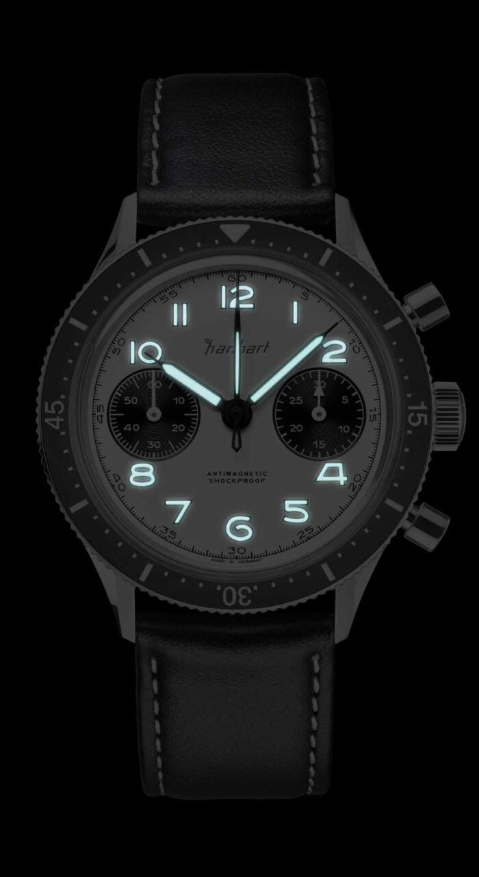 Les aiguilles et les index reçoivent un revêtement Super-LumiNova® C1 GL X2, offrant une luminescence blanche soutenue en faible luminosité. Les aiguilles du chronographe présentent une légère courbure à leur extrémité pour réduire les erreurs de parallaxe lors de la lecture des mesures. Le logo ailé Hanhart est placé sous l’index de 12 heures, rappelant la période d’origine du design.