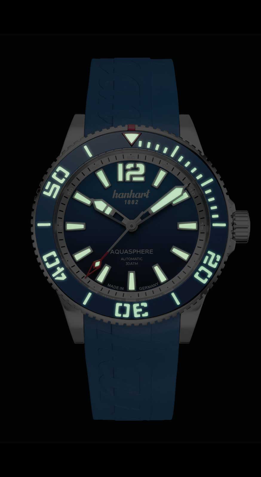 Le cadran présente un dégradé noir-vers-bleu conçu pour améliorer la lisibilité au fur et à mesure que l'on plonge. Les aiguilles et les appliques sont traitées au Super-LumiNova® C1 GL X2 : la teinte lumineuse blanche facilite la lecture nocturne ou en eaux profondes. Pour distinguer l'aiguille des heures de celle des minutes, la première reçoit une barre contrastée, tandis que la pointe de la seconde est peinte en rouge pour un repère visuel rapide. Le réhaut périphérique permet une lecture précise des secondes et le logo moderne Hanhart s'inscrit discrètement sur le cadran.